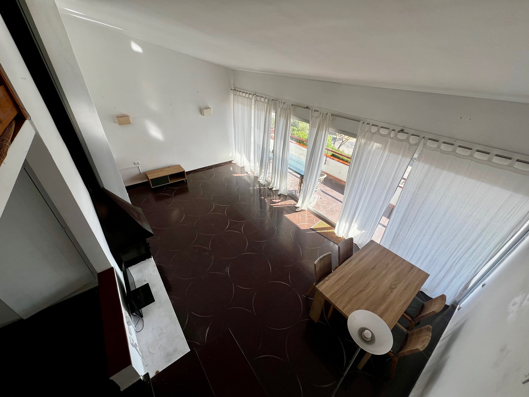 Apartamento en un primer piso sin ascensor. Terraza que da al jardín y a la piscina donde disfrutar de desayunos o comidas al sol. Salón con sofá cama para 1 persona, TV y salida directa a la terraza.