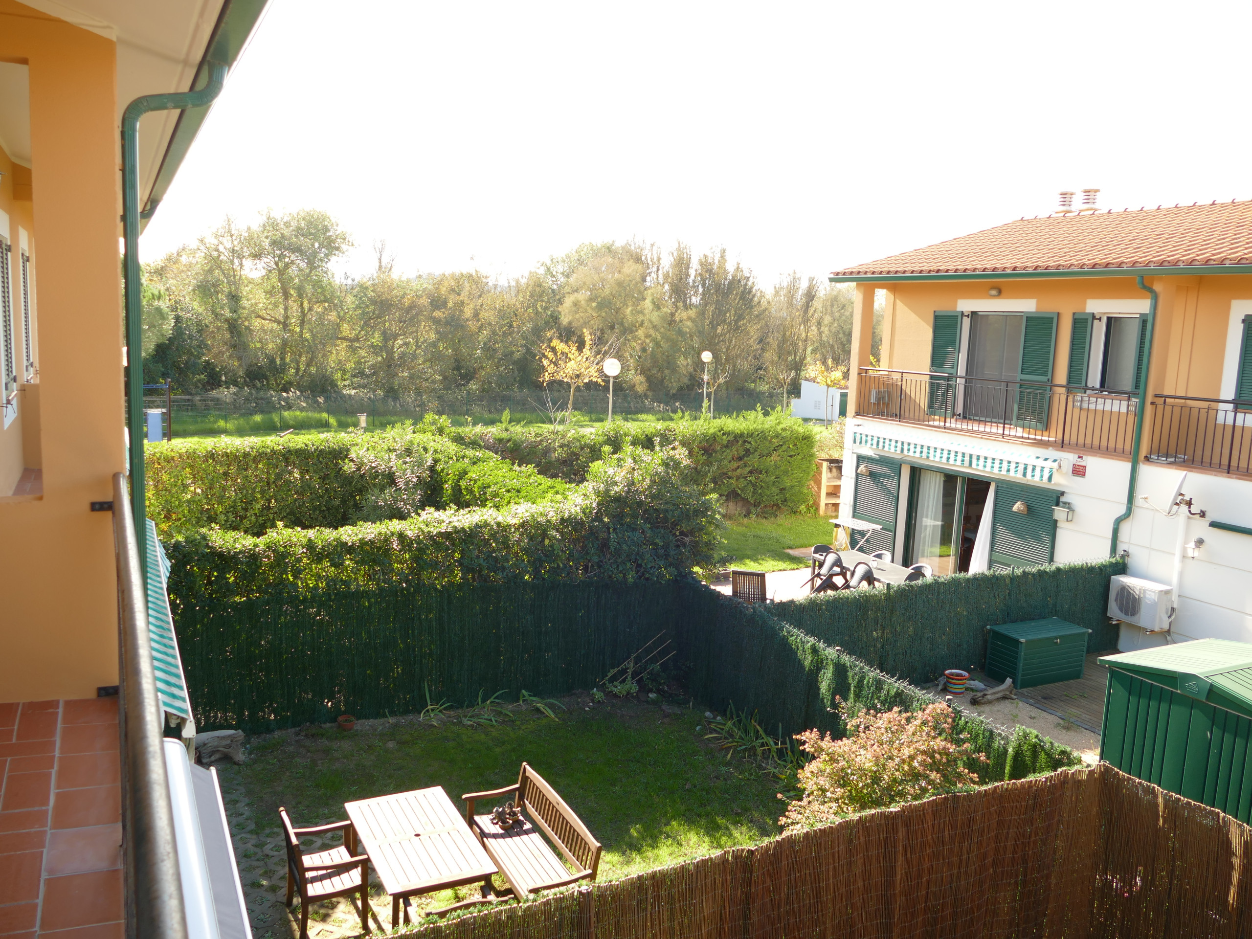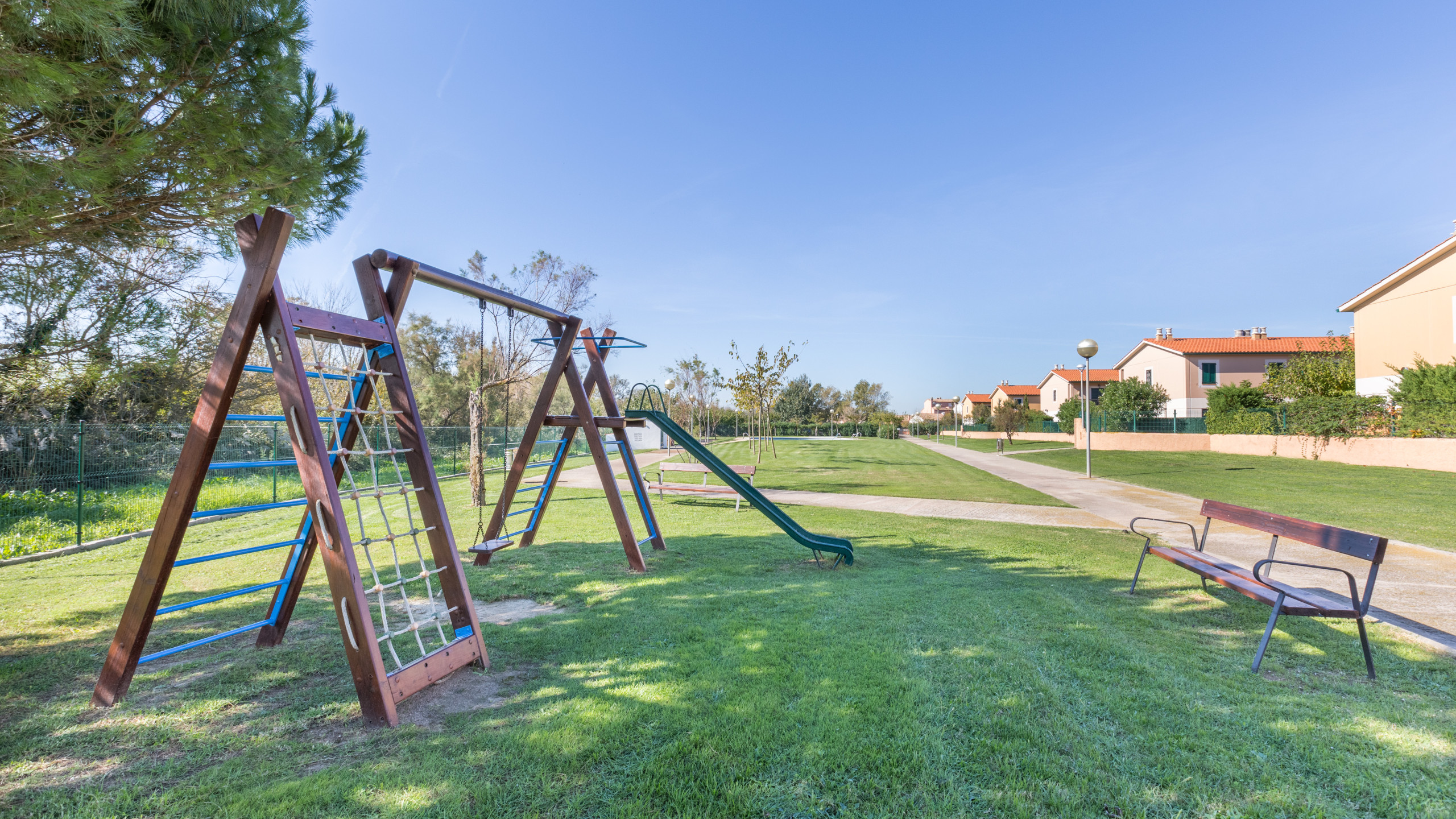 La casa ofrece amplias zonas exteriores con piscina y jardines comunitarios, además de un parque infantil. Tiene capacidad máxima para 6 personas y se distribuye en dos plantas: