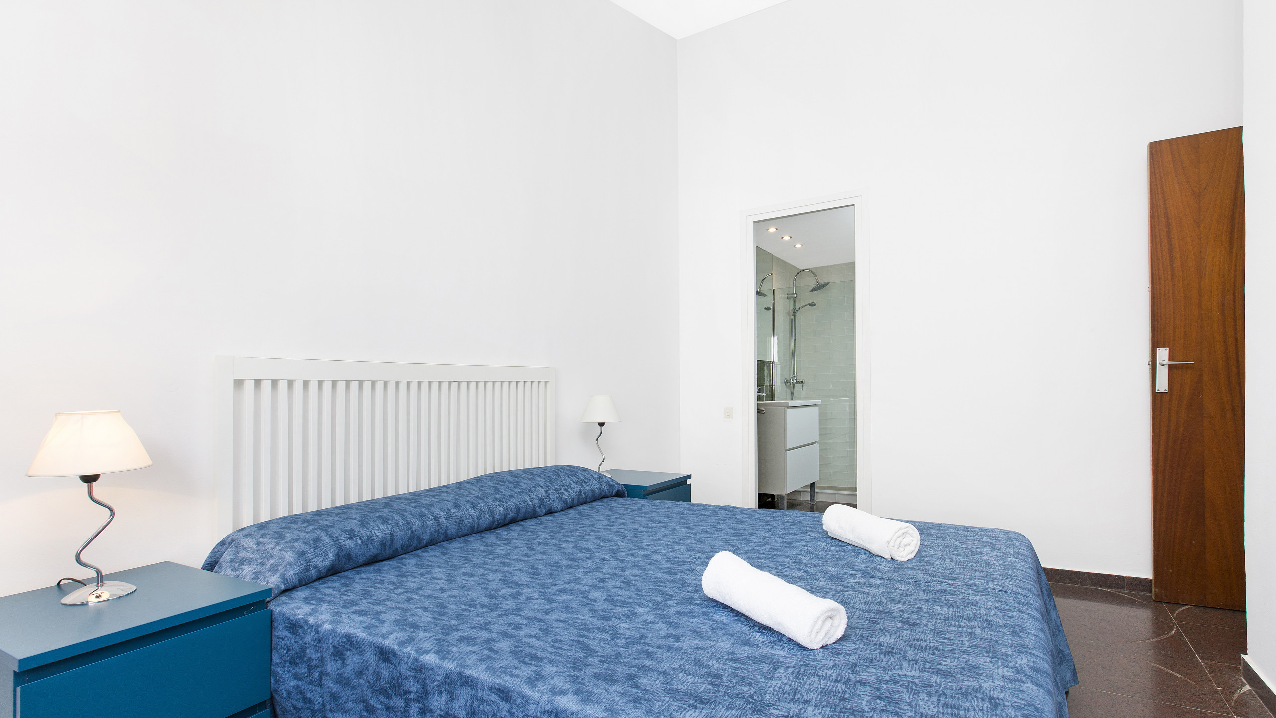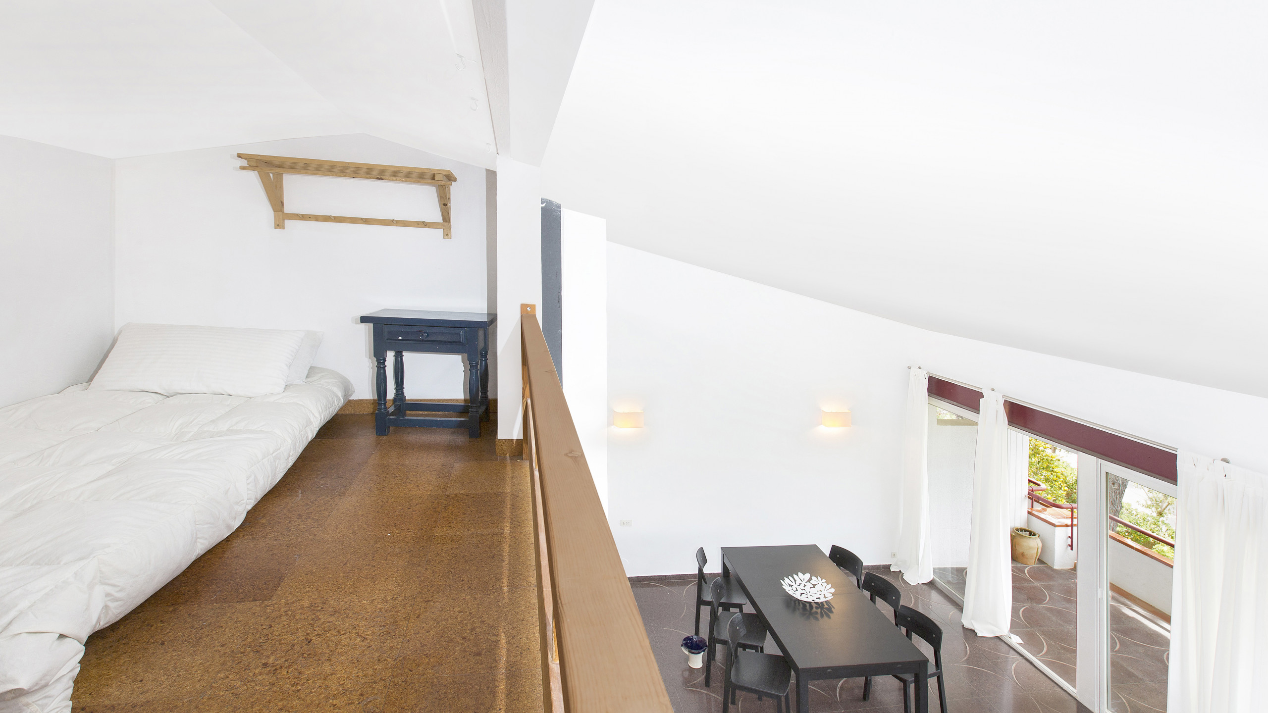 The main bedroom has 1 double bed (140x200cm) and direct access to the terrace, the second bedroom has 2 single beds (90x200cm).