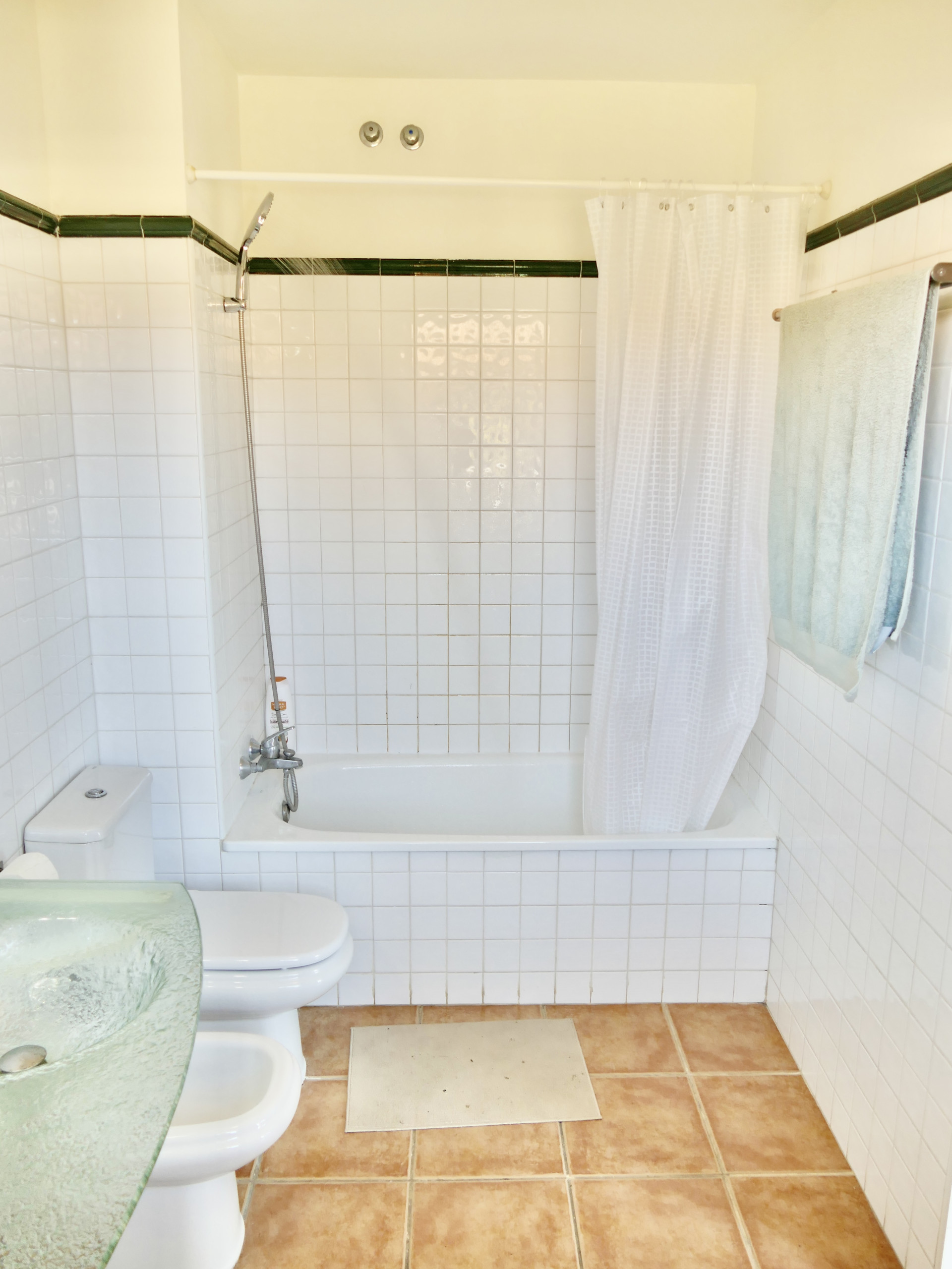 - 1 suite with a double bed (150×190 cm), bathroom with bathtub, and balcony.