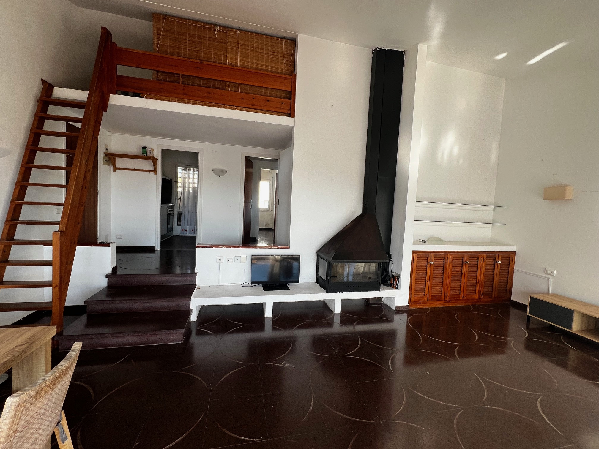 Depuis le salon, il y a un escalier qui mène à un petit grenier avec un matelas.