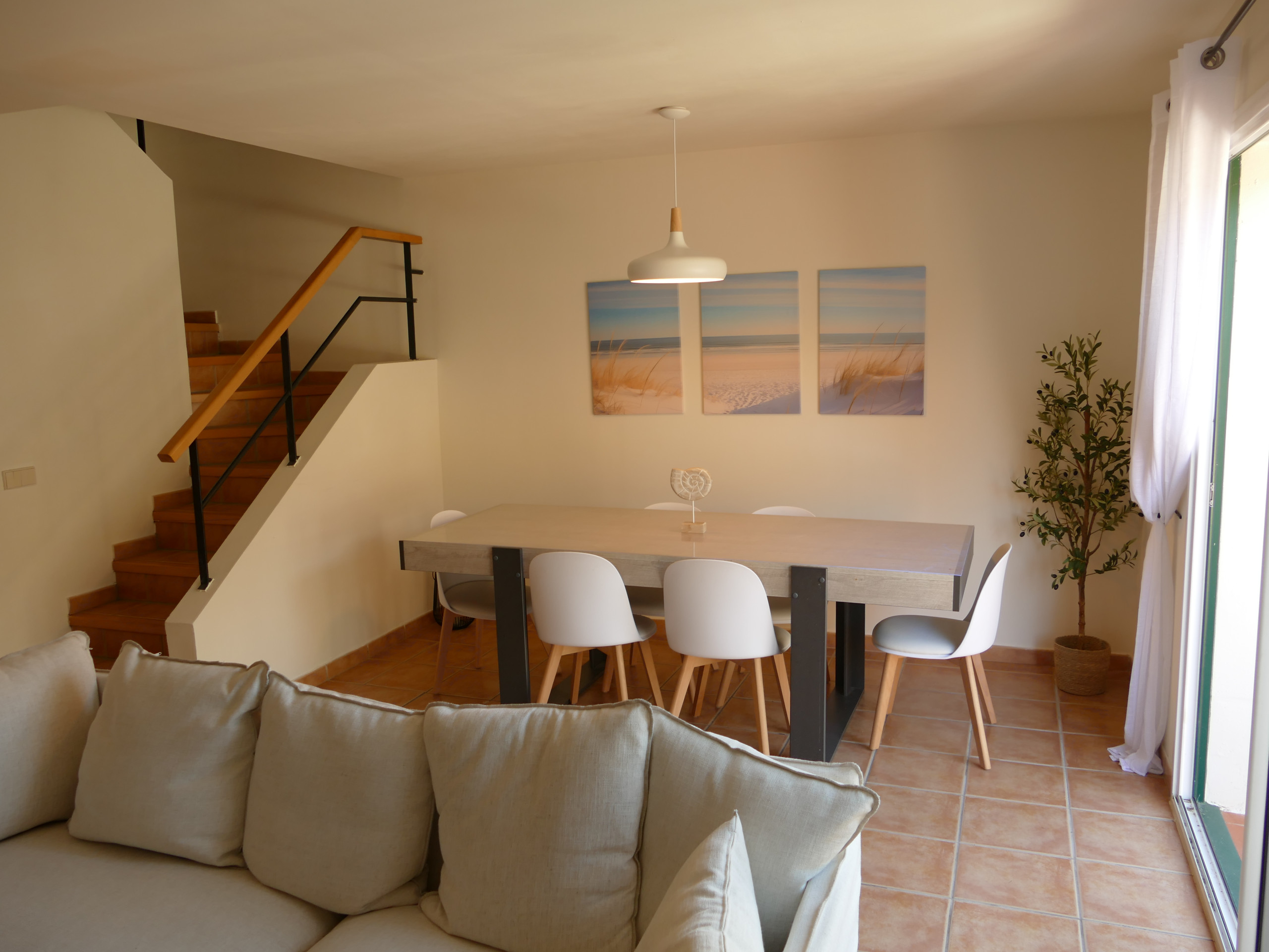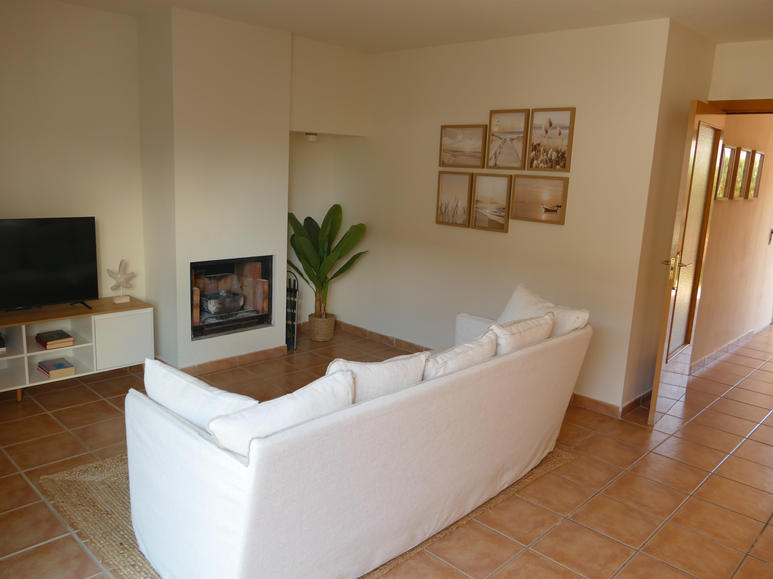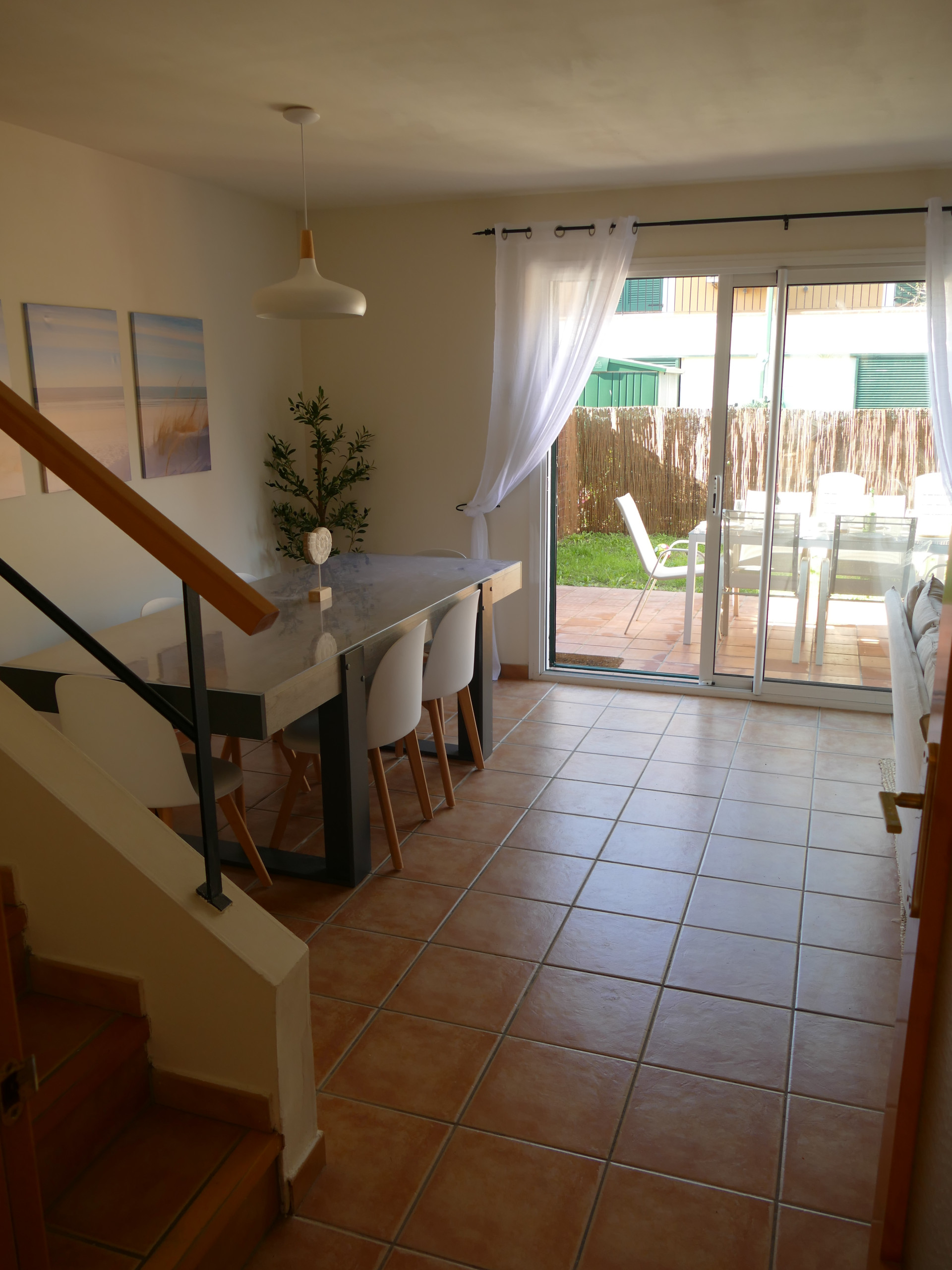 - Salon-salle à manger avec cheminée et accès direct au jardin.