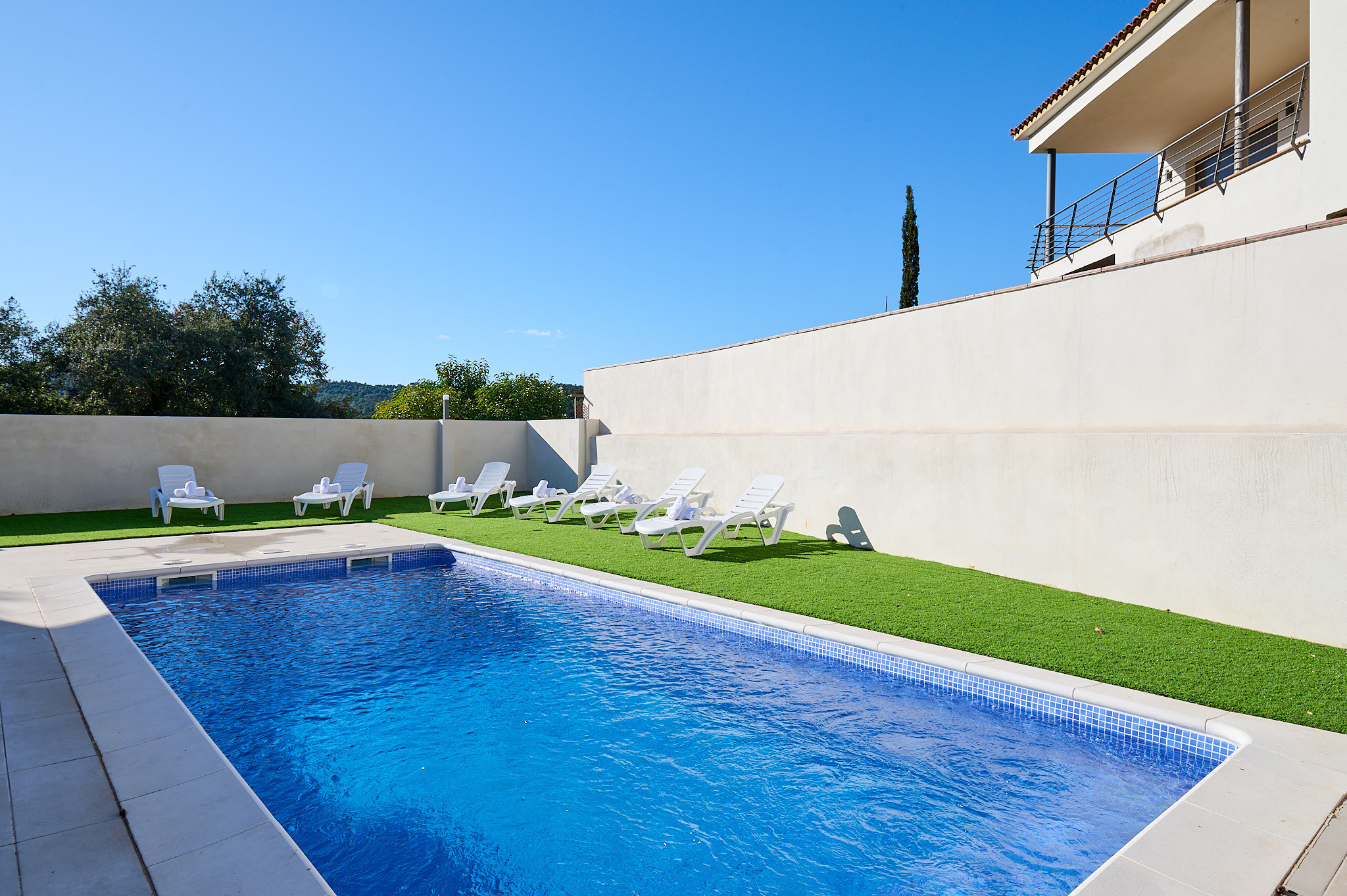 À l'extérieur, vous trouverez un espace conçu pour profiter du beau temps : un jardin avec gazon artificiel, une piscine privée de 7 x 3 mètres, une douche extérieure, des transats confortables pour se détendre au soleil et du mobilier d'extérieur idéal pour manger ou dîner en plein air.